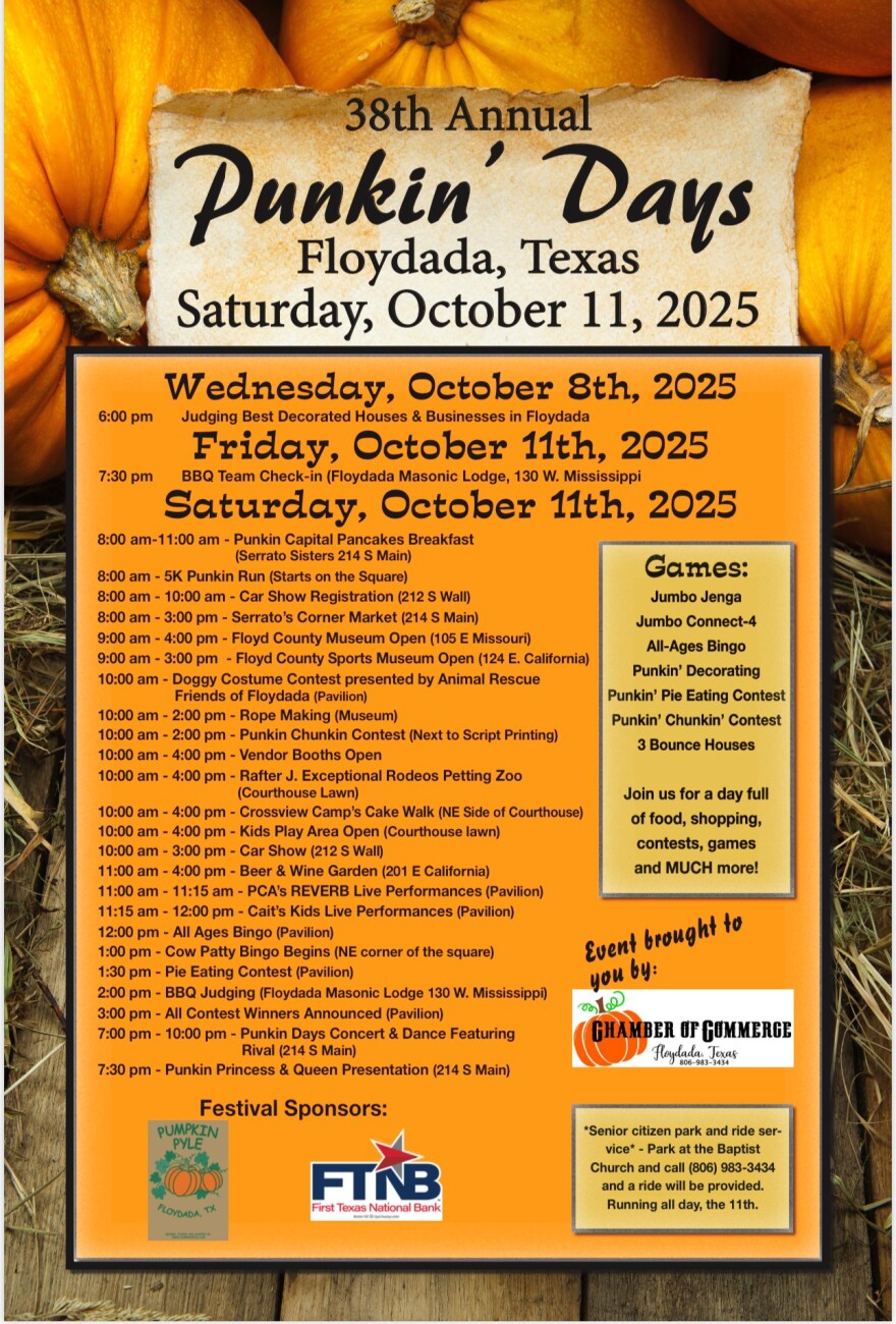 The Lubbock Police Department is investigating a case of vandalism at the Lubbock Lake Landmark's Wild Flower Trail which caused estimated $10,000 in damages. This weekend is the 38th annual Punkin’ Days: Floydada’s celebration of its pumpkins. Our reporter Sean Ryan has more on what to expect from this year's festivities. This Sunday is also the last day of the 2025 season for Lubbock's splash pads.